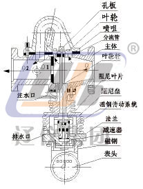 流量計是按節(jié)流元件,分流原理設(shè)計制造的;被測蒸汽進(jìn)入流量計主體后分為兩路,一路Q1通過節(jié)流孔板(此部分蒸汽不作計量),在孔板兩側(cè)產(chǎn)生壓差△P,在此壓差作用下,另一路Q2流經(jīng)噴嘴噴射在葉輪上,葉輪軸轉(zhuǎn)動。為減慢葉輪軸轉(zhuǎn)速,葉輪軸下方按有阻尼葉片并浸沒在阻尼室內(nèi)水中。由于兩路有同一壓差△P,在規(guī)定流量范圍內(nèi),根據(jù)流體相似原理,兩路蒸汽流量Q1和Q2之間的比例關(guān)系基本為常量,這樣只要測出流經(jīng)噴嘴部分的流量Q2,即可知總流量Q。