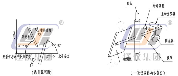 干燥的散裝固體物料自由落體沖擊到傳感檢測(cè)板(沖板)上后,傳感檢測(cè)板產(chǎn)生機(jī)械偏移。然后散裝物料流連續(xù)而無(wú)阻礙的通過(guò)。即:由于沖擊力與傳感檢測(cè)板具有一定角度,故該力分解成一個(gè)水平分力和一個(gè)垂直分力。垂直分力由變送器的機(jī)械結(jié)構(gòu)克服而不起作用,而水平分力有一個(gè)差動(dòng)傳感器(線性可調(diào)差動(dòng)變送器),這個(gè)信號(hào)經(jīng)與之相連的積算儀檢測(cè)和處理,得出瞬時(shí)流量和累積流量。